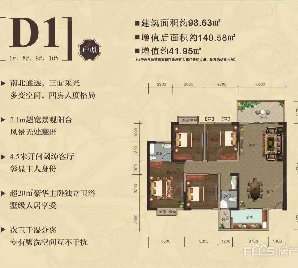 海悦华府1#8#9#10#楼d1户型赏析 南北通透,三面采光,多变空间,四房大度格局 2.1m超宽景观阳台,风景无处藏匿 4.5米开间阔绰客厅,彰显主人身份 超20㎡豪华主卧独立卫浴,墅级人居享受 次卫干湿分离,专有洗空间互不干扰