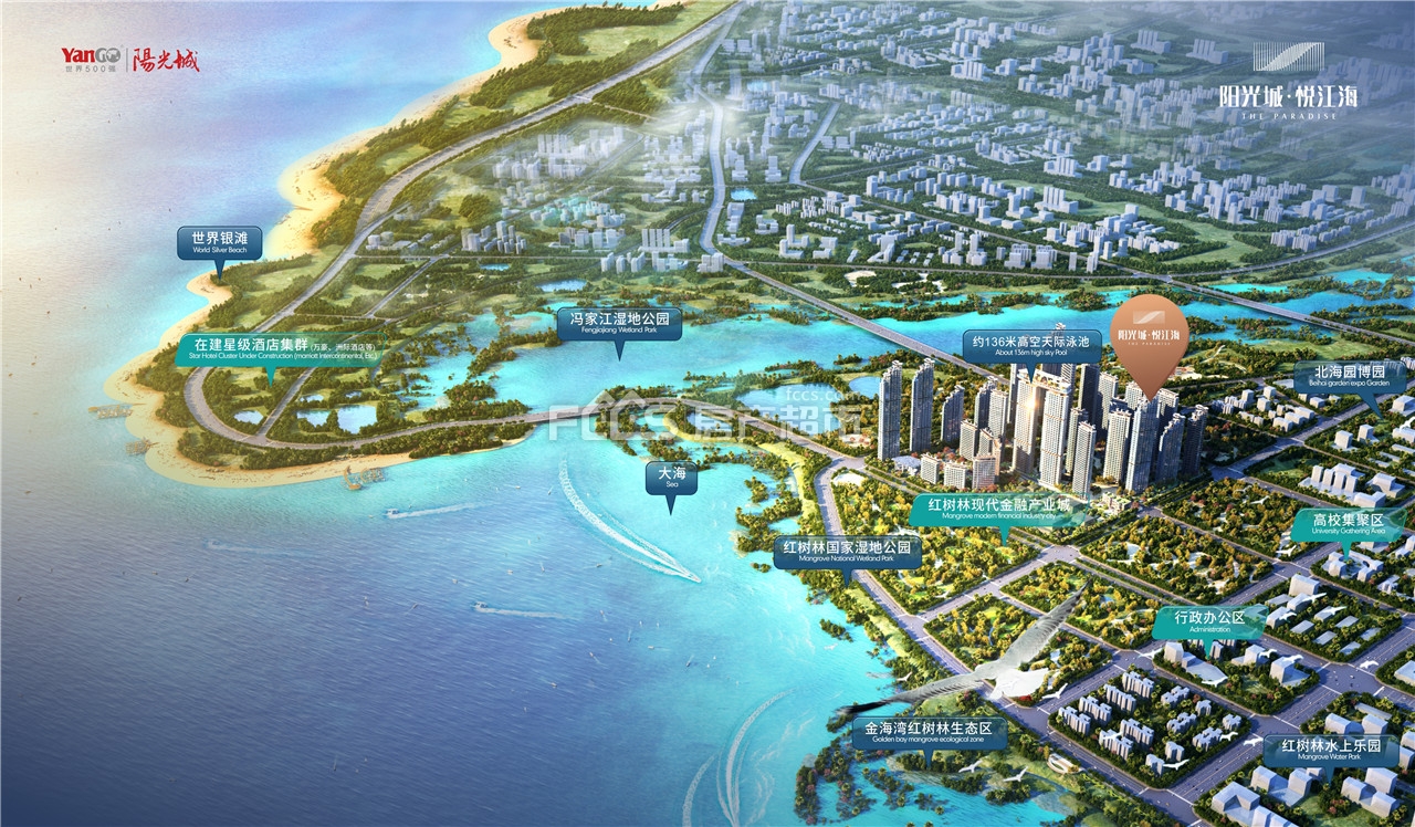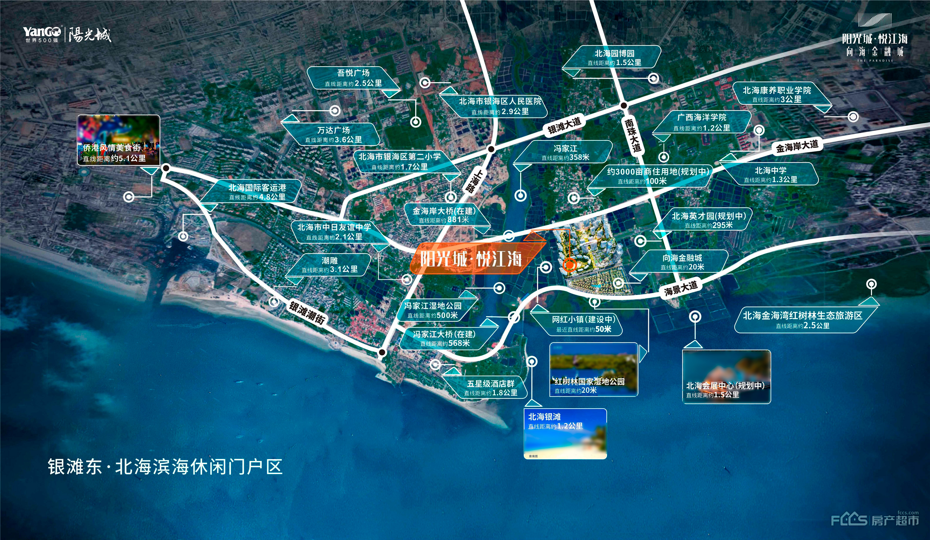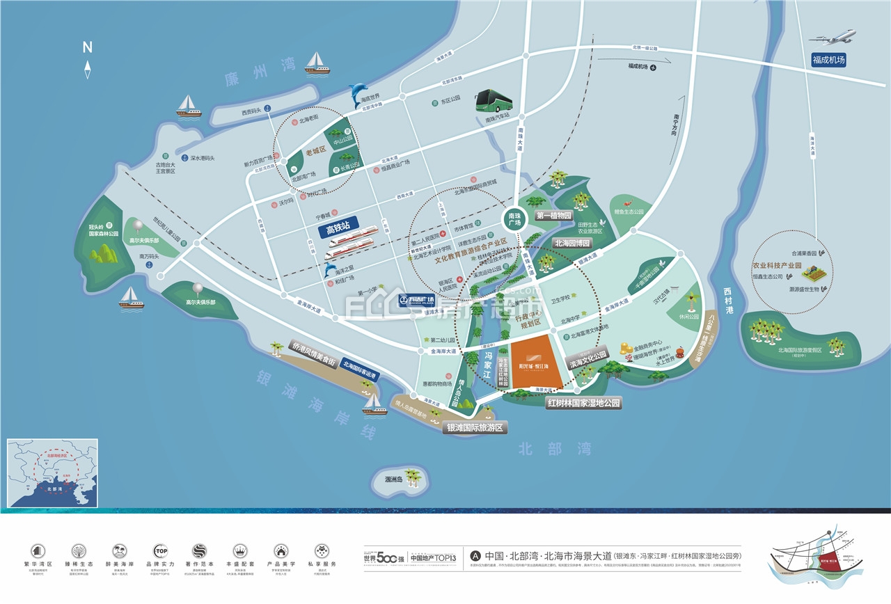 北海市银滩东·冯家江畔·红树林国家湿地公园旁(银海区金海岸大道与南珠大道交汇处)