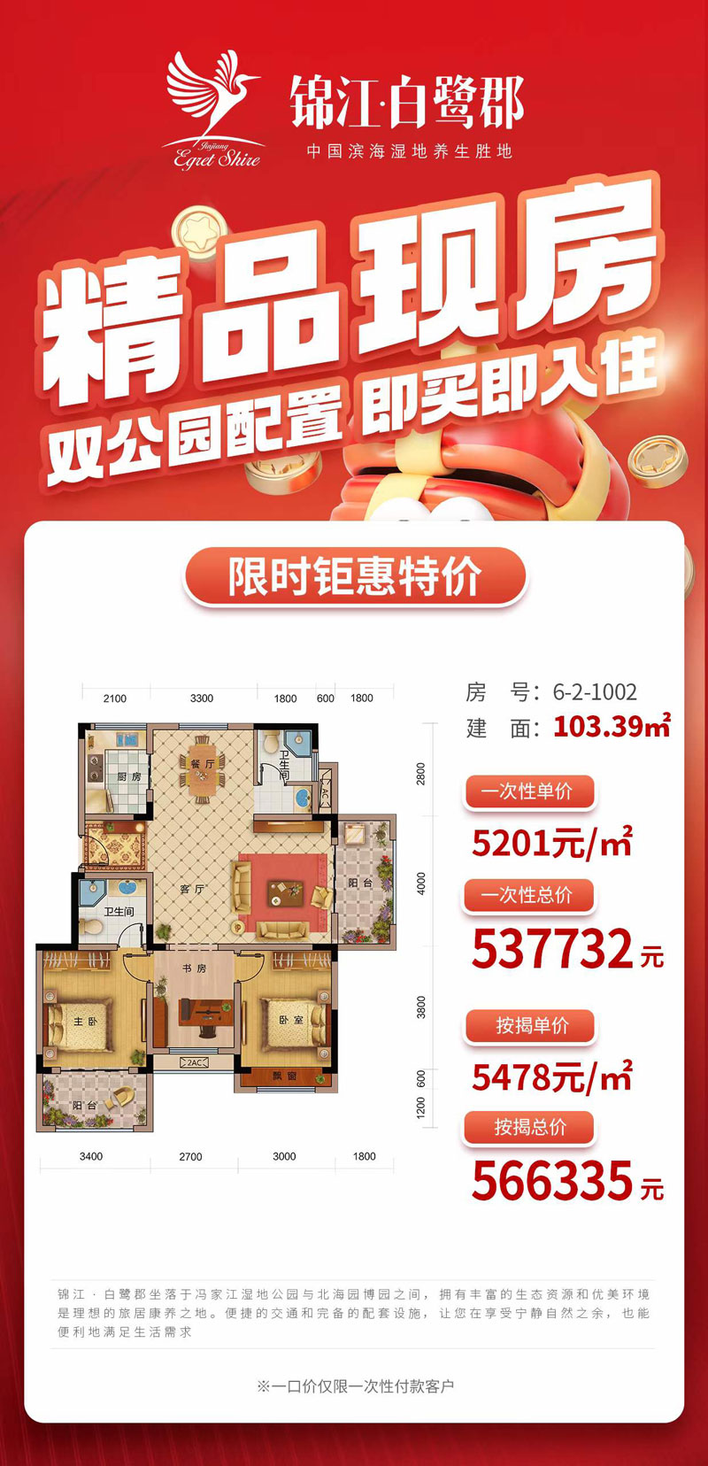 [导读]锦江·白鹭郡精品现房特价5201元/㎡,仅此1套!双公园配置,即买即可入住。