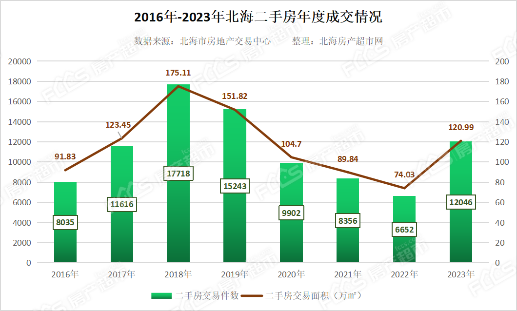2023年全年,北海二手房销售同比下降六成左右,为近七年来最低值。根据北海房地产网数据统计显示,2023年1-12月,北海二手房交易12046套,与去年同期相比增长约81.09%;北海二手房交易面积120.99万㎡,与去年同期相比增长约63.43%。其中,北海二手住宅交易11614套,与去年同期相比增长约79.42%;北海二手住宅交易面积约119.39万㎡,与去年同期相比增长约68.61%。