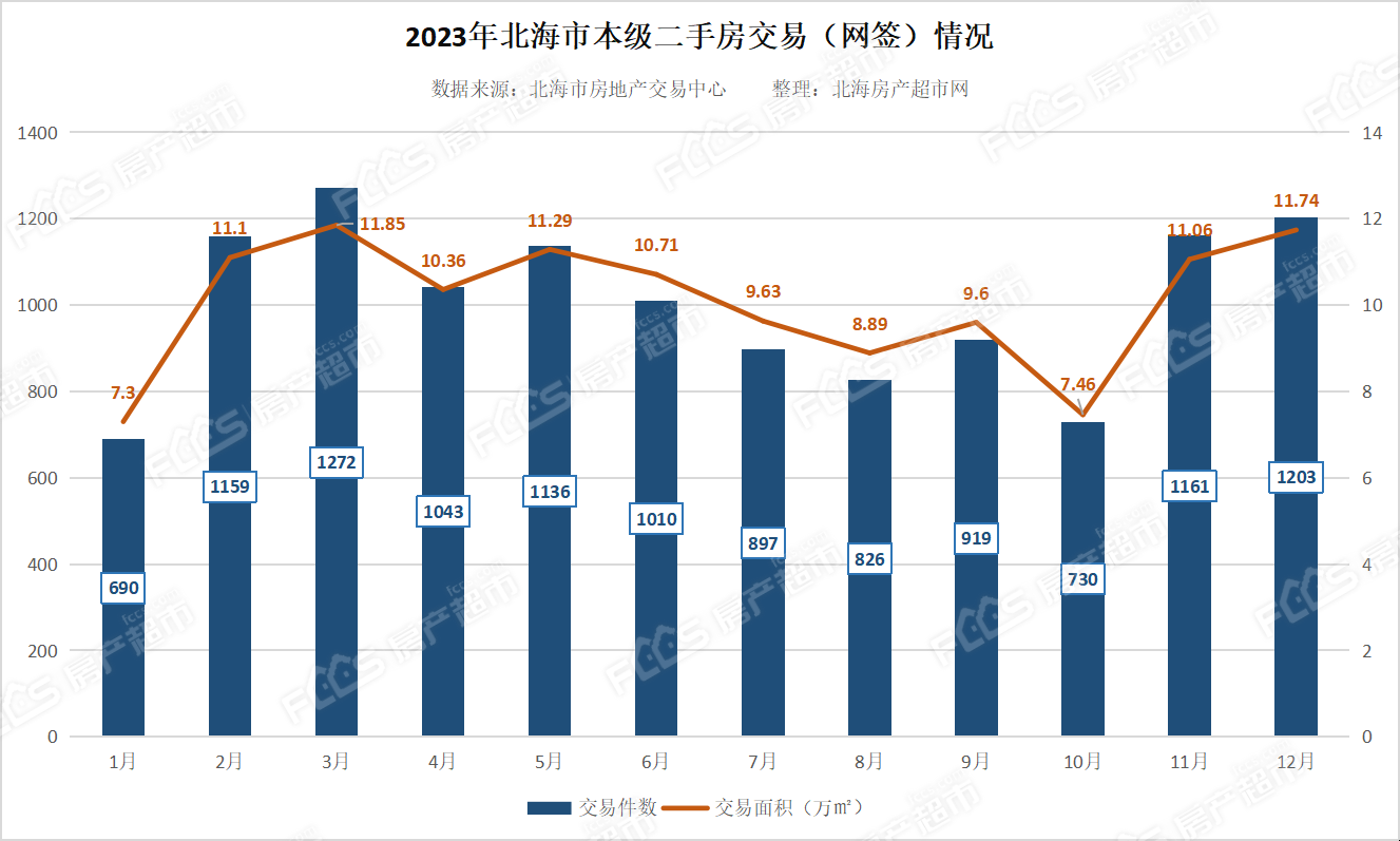 从下图走势可以看出,2023年每月北海二手房成交量走势较为平缓,1月份交易量处于全年低位水平,仅交易了690套,交易面积约有7.3万㎡;3月份市场处于全年最高值,成交了1272套,交易面积约有11.85万㎡。