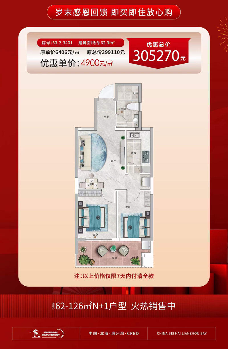 中电海湾国际带装修海景准现房新春特惠工抵房,纯南朝向,建面约62㎡海景两居特惠单价4900元/㎡,仅此1席。目前,中电海湾国际建面约62-126㎡的n 1户型销售中。